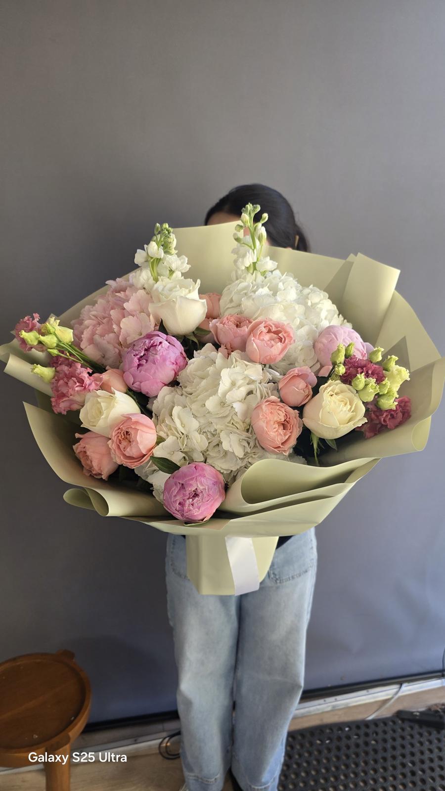 Elegance and charm bouquet, featuring the timeless allure of peonies, roses paired with the vibrant, cheerful hydrangeas, stocks, lisiantus . This stunning arrangement showcases a harmonious blend of classic beauty and bold colors, creating a captivating display that adds warmth and sophistication to any setting.