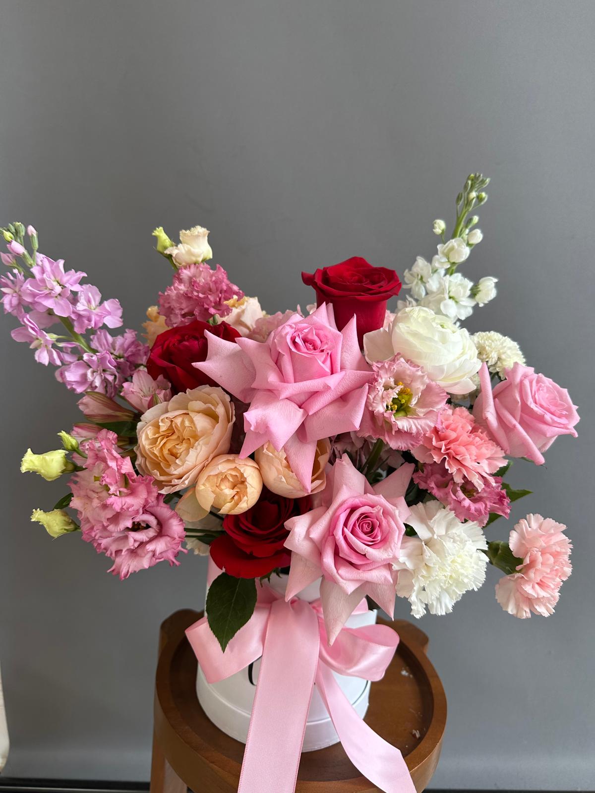 Delicate roses intertwine with lisiantus and charming stocks in “Eternal Elegance.” This floral composition boasts a sophisticated mix of blooms, showcasing their vivid colors and enchanting scents. The graceful roses bring a touch of timeless beauty, while the orchids add an exotic flair, and the waxflower offers a subtle, sweet aroma, creating a harmonious and captivating display.